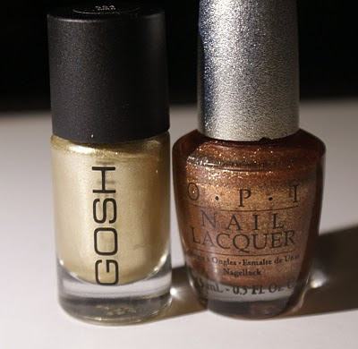 Muita tällaisia kullansävyisiä suosikkeja on nää kaksi , eli Gosh Gold ja OPI DS Glow. Goshia on mulla menossa jo toinen purkki, sitä toista joka on melkein loppu käytän Konad-leimaamisen. On siis ihan täydellinen lakka konadeihin ! Glow taas on semmonen luottolakka joka kuivuu nopeasti ja näyttää nätiltä aina =)
