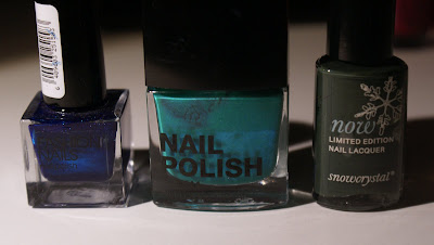 Sinisistä/vihreistä lemppareita on (tällä hetkellä) We Care Iconin Magic Sapphire josta mulla onkin vähän alempana joku postaus, H&M No Mambo Jambo joka on tommonen turkoosinvihreä jossa on kiva sininen shimmer ja Snowcrystalin Military Green josta mulla taitaa myös olla jossain alempana postaus.