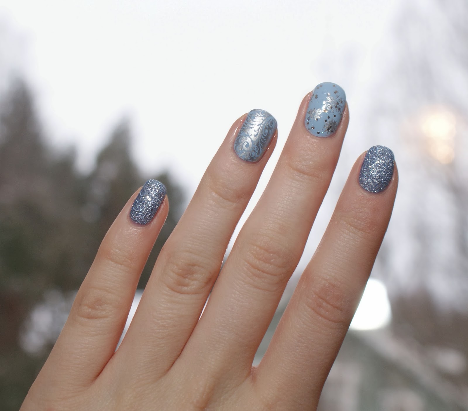 IsaDoran Sky crush niminen tekstuurilakka on ihan  täydellinen jäinen sininen. Sen kaveriksi halusin kuitenkin jotain muutakin ettei mene ihan tylsäksi, joten sekoittelin itse kylmän vaaleansinisen sellaisen puutteessa :D Nimettömään leimasin tuollaisen kiekurakuvion hopealla, ja keskisormeen lumihiutaleita sekä laitoin glitteriä päälle.