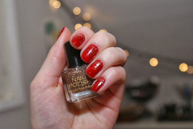 Tämän päivän glitteryhdistelmä syntyi tummanpunaisella Zoyan Alix-jellylakalla ha H&Mn kultaisella Golden Days-glitterillä.