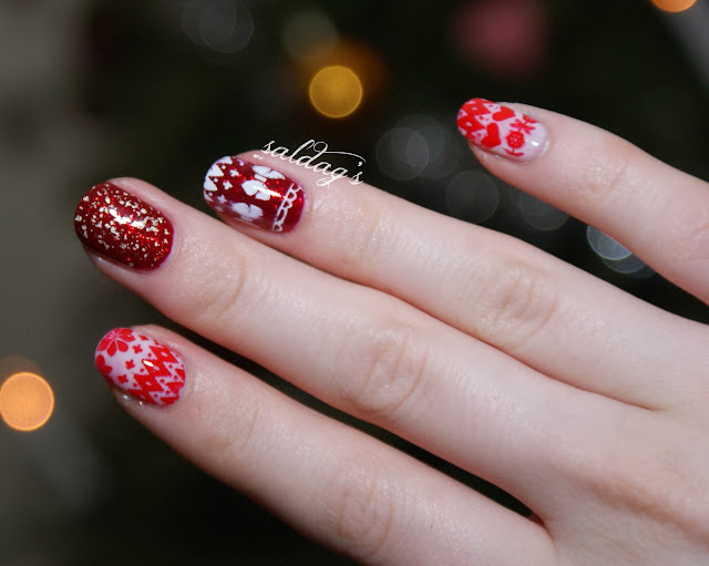 Rakastan joulua. Siksi musta on ihan ok aloittaa joulufiilistely marraskuun puolessa välissä(ostaa joulukalenteri ja ripustaa jouluvalot) , ja ekat joulukynnet voi siis tehdä heti joulukuun eka ! Tykkään näistä tosi paljon. Oon ihaillut jo pari vuotta erilaisia Christmas Sweater nailart-juttuja netistä ja yrittänyt totetuttaakin niitä, mutta niistä ei ikinä oo tullut tarpeeks hyvät:D OB-Nailsin superleimauslaatassa (XXL E) on onneksi kaiken muun ihanan lisäksi aika hyvät leimat tällasten väsäämiseen.