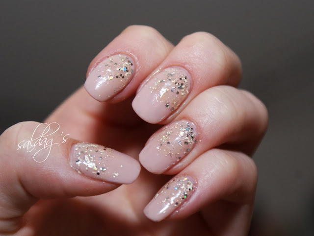 Lisäsin beigen pohjan päälle vähän blingiä H&M:n Skyscraper-lakalla ja OPI:n valkokultaisella Pure-hippulakalla.