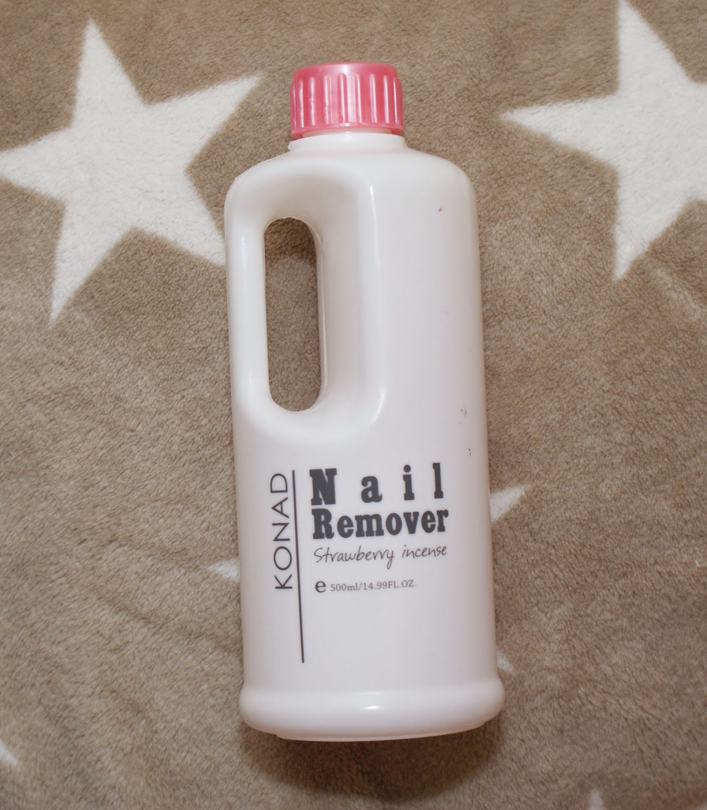 Kynsilakanpoistoaineena käytän Konadin mansikantuoksuista removeria. Sitä saa tilattua esim. Cesarsshopista tai ostettua Stockalta. Jos vihaat kynsilakanpoistoaineen hajua, tämä on sinun juttusi.