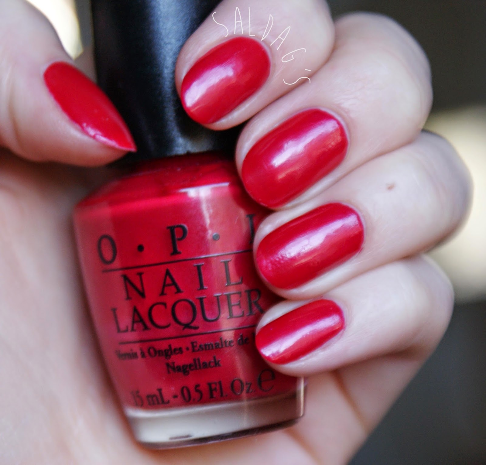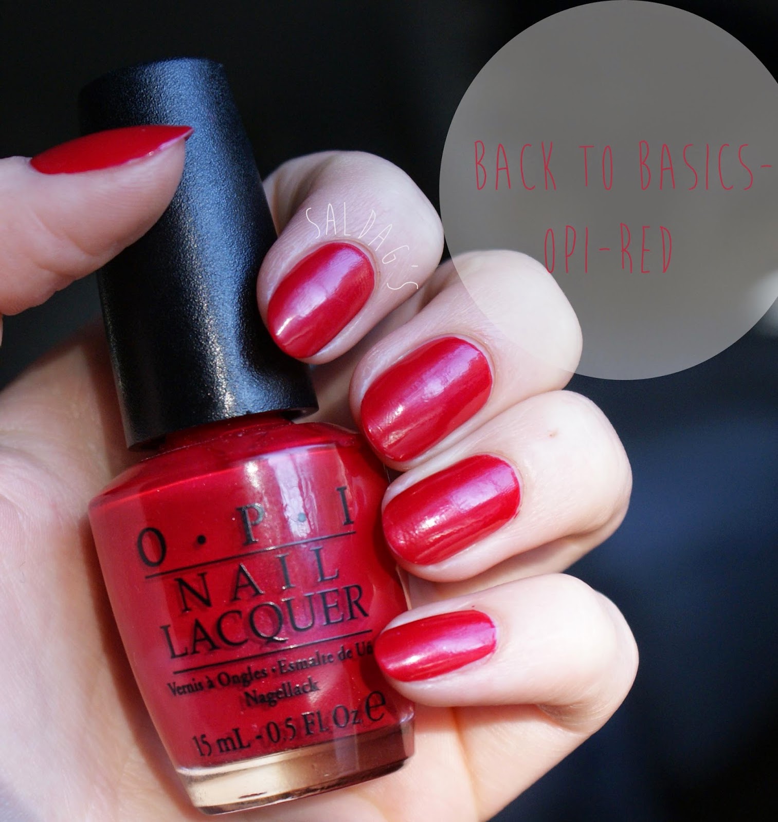 Opi Red on perus punainen, vähän enemmän kylmän puolella, ja siinä on ihan vähän vaaleaa shimmeriä joka ei kuitenkaan kynnellä pahemmin näy. Levittyy tosi helposti, ja tämä onkin varmasti helppo ja varma valinta jos ei kynsilakoista niin tiedä. Ei mikään lempparipunainen mutta ihan kiva.