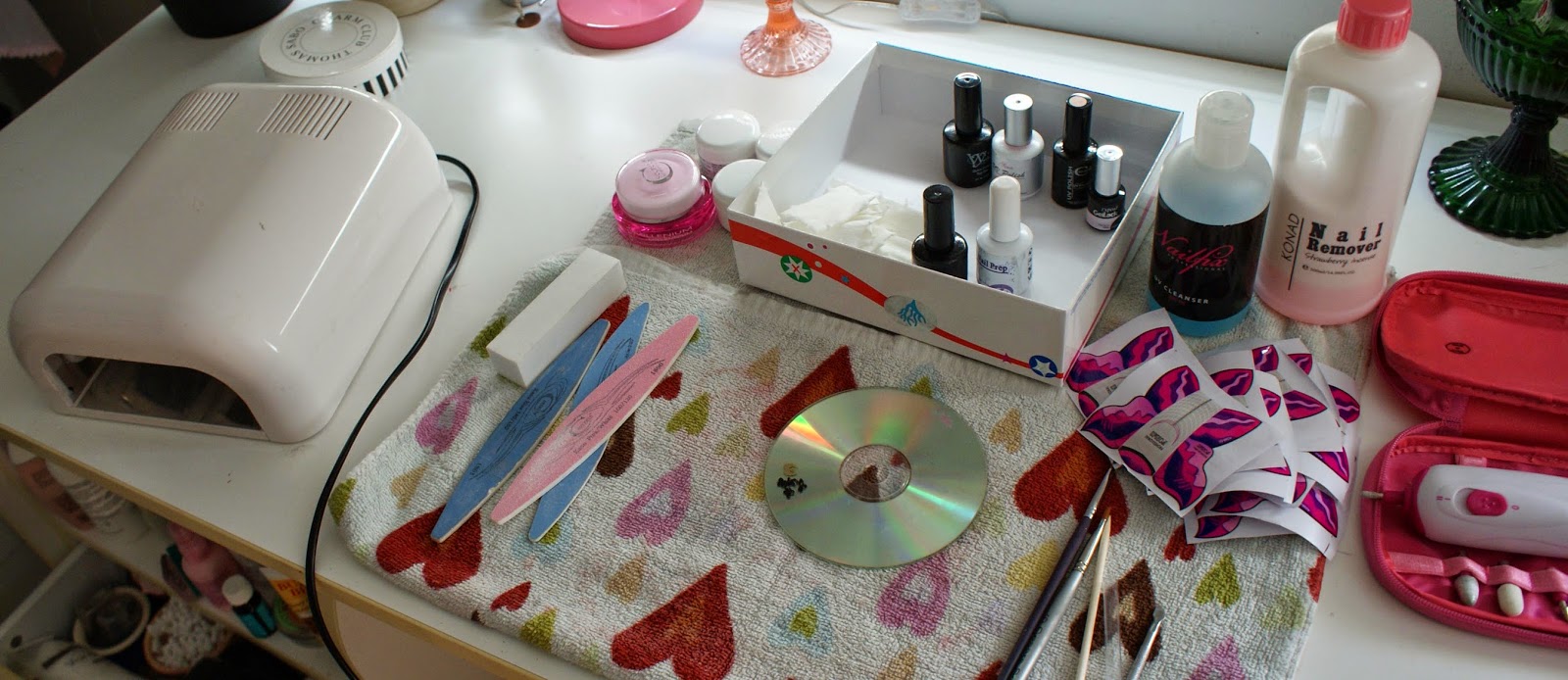 Muita juttujaa mitä pöydälläni on aina kun teen kynsiä. on tietty siveltimet, sitten kynsinauhatyökalu, puutikku ja puhdistuslappuja. CD-levyä käytän geelien sekoittelualustana.