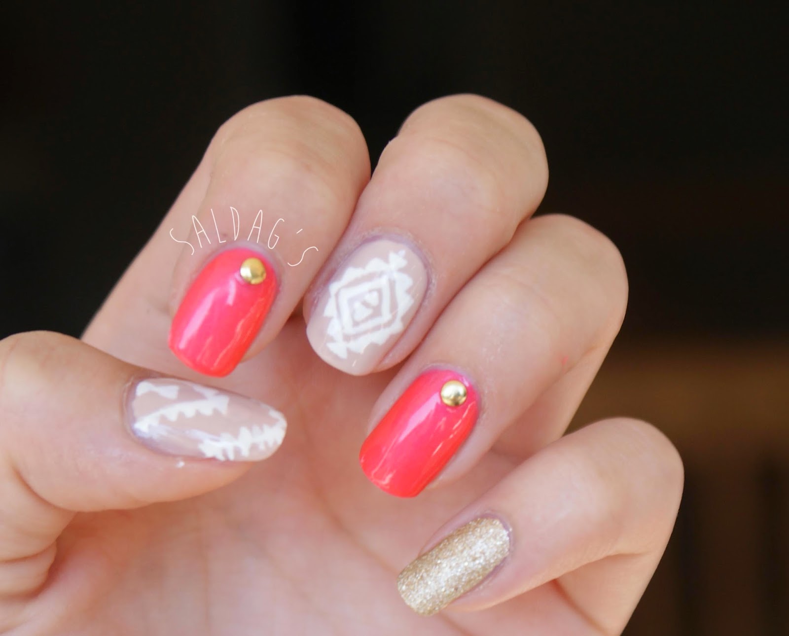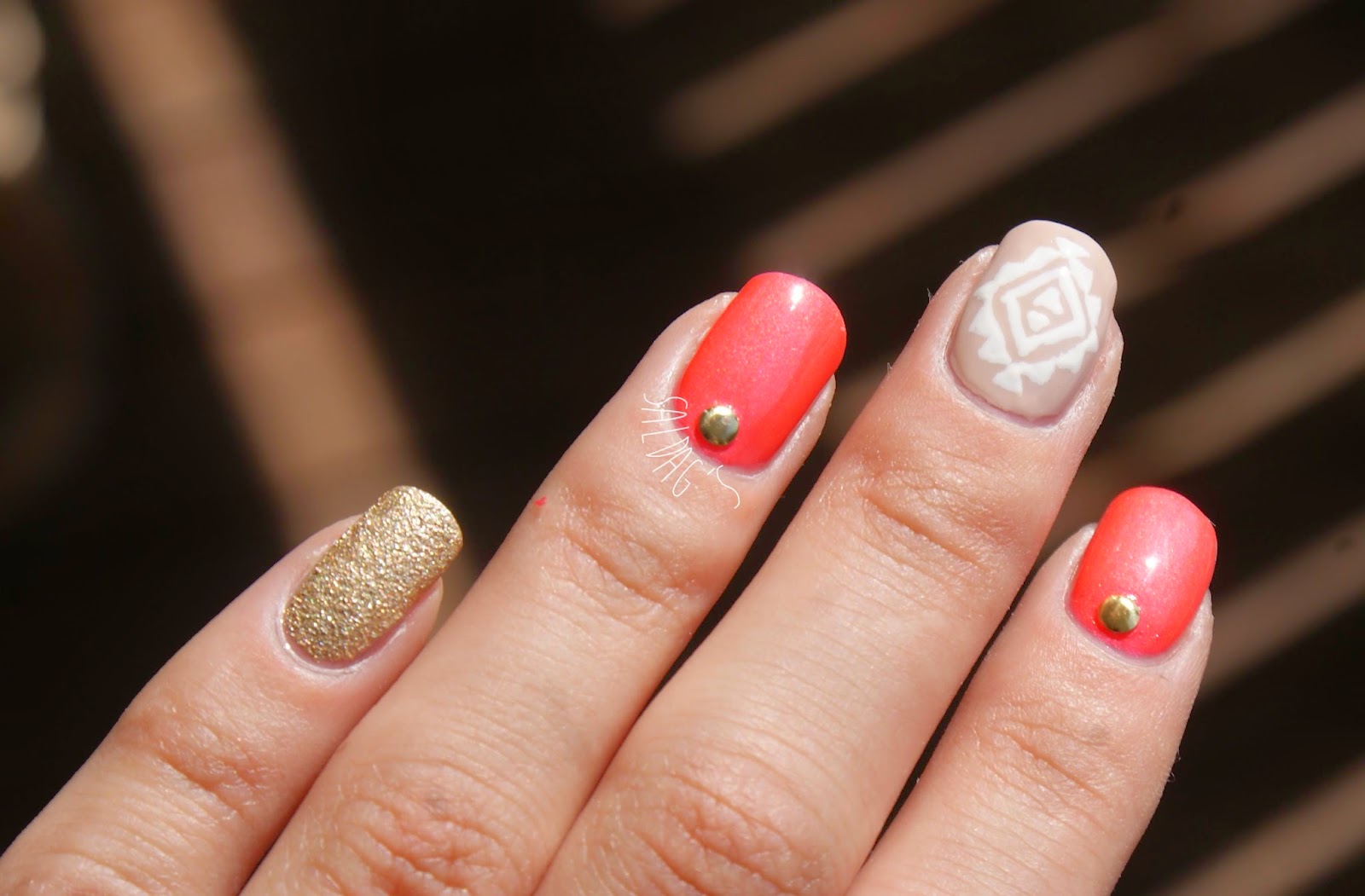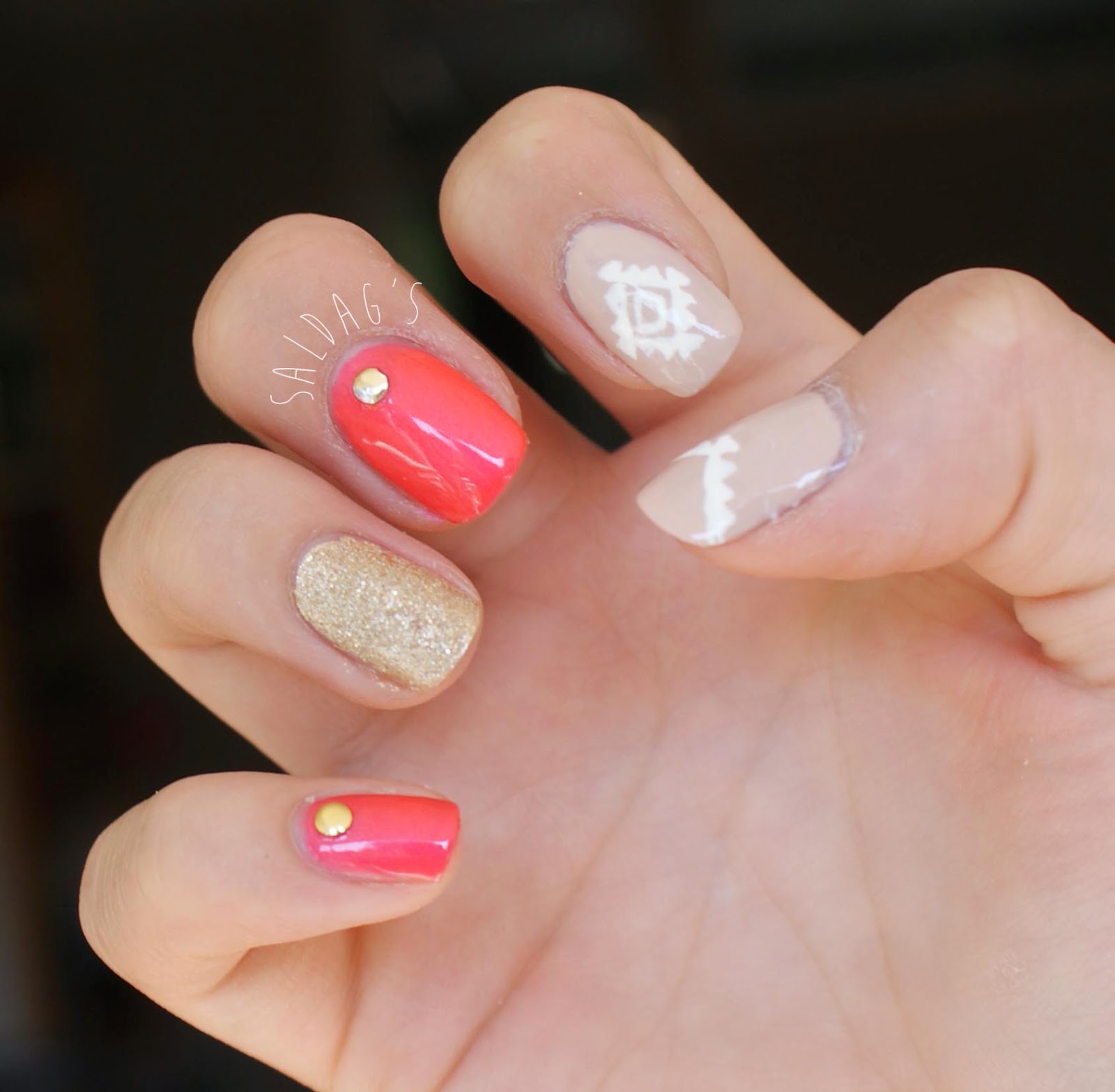 Käytin koristelussa pitkästä aikaa niittejä ja Orlyn Instant artist koristelulakkaa.